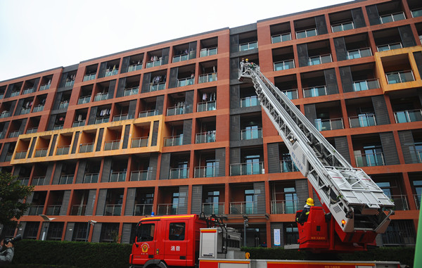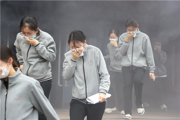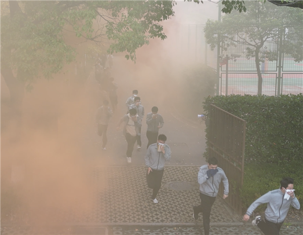 培训结束后后,14:30随着总指挥戴志刚书记一声令下,现场警报声响起,消防应急疏散及高空救援、消防车紧急出水演练正式启动。同学们在后勤保障人员、教导员及学导员的引导下,分别从浓烟滚滚的男女生公寓各个逃生疏散通道有序快速疏散,所有人员手捂口鼻猫着身子经过烟雾通道安全迅速的疏散至指定地点集合,清点人数,查看有无人员受伤。