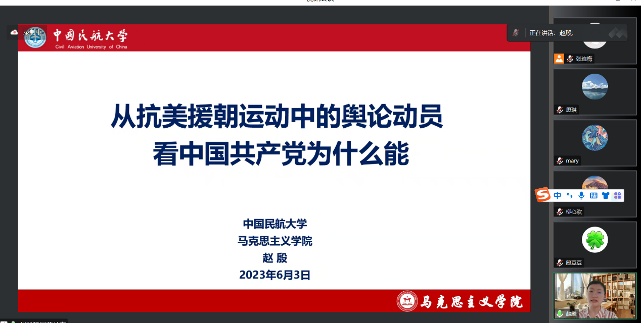 赵殷老师声情并茂地讲述了“从抗美援朝运动中的舆论动员看中国共产党为什么能”这一主题,在一个个案例中层层递进、娓娓道来,从“为什么、怎么做以及看成效”三个方面讲出了制胜法宝“气”所形成的强大合力。