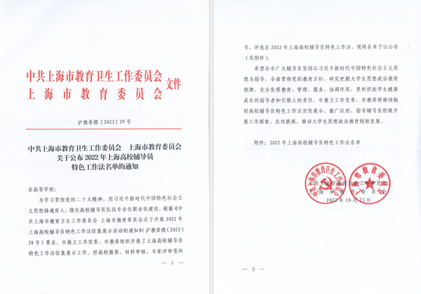 近日,上海市教育卫生工作委员会、上海市教育委员会公布了2022年度上海高校辅导员特色工作法名单(沪教委德〔2023〕29 号),我院民航维修学院辅导员魏贝贝申报的《“四新”高职院校班级建设和管理工作法》经学校推荐、材料审核、专家评审等环节成功入选。