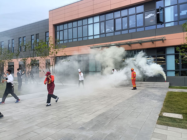 首先进行的是模拟食堂后厨着火险情处置。工作人员发现火情后迅速组织灭火;发现无法把火灭掉后,迅速疏导人员疏散。应急指挥中心发现报警后,迅速组织微型消防站队员前往食堂处置。食堂所有工作人员在微型消防站队员的指挥下迅速疏散至安全地带,并检查有无人员伤亡,微型消防站队员紧急处置火情。