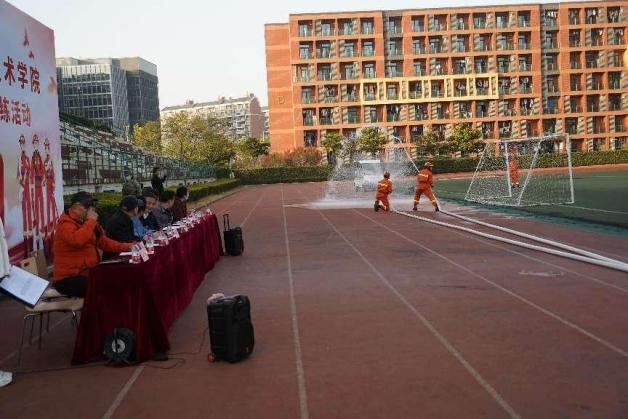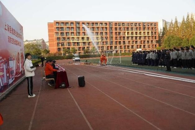 紧接着,沪杰保安王晓兵队长和马徐帅副队长带领8名秩序维护队员向同学们展示了两带两枪迅速出水灭火展示、机动消防泵出水灭火展示、50米往返跑灭火器灭火展示,展现出了保安队员“特别能吃苦、特别能战斗、特别能奉献、特别懂专业”的良好风采,获得了同学们的阵阵掌声。为了做好本次展示,他们利用休息时间进行了加紧训练、彩排。