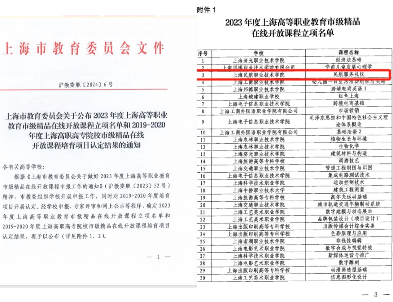 近日,上海市教育委员会公布了《2023年度上海高等职业教育市级精品在线开放课程立项名单》,经学院申报、专家评审和网上公示等程序,民航乘务学院航空乘务教研室郝姚丹老师作为课程负责人,主持建设的《民航服务礼仪》课程荣获2023年度市级精品在线开放课程立项。