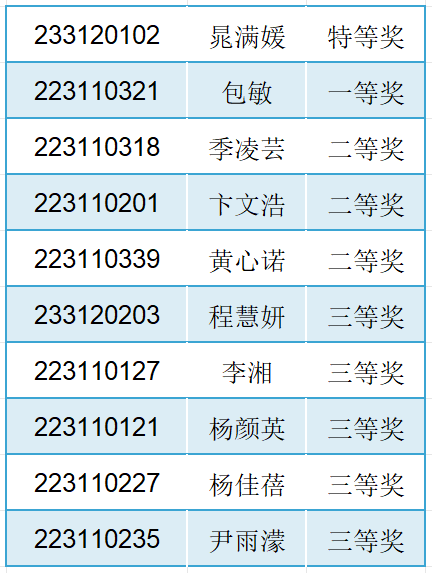 本次大赛最终产生特等奖1名,一等奖1名,二等奖3名,三等奖5名。获奖学生名单如下: