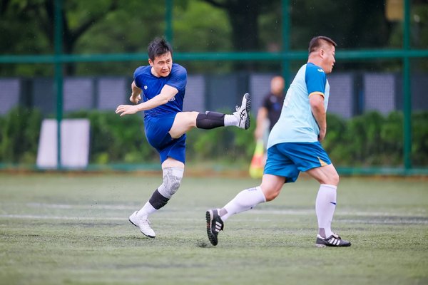 决赛当日,正值上海梅雨季节,热身和比赛时都下起了大雨。决赛开始后,我队按照陆东队长安排以控制比赛节奏为主,同时利用雨天地滑的特点多找机会远射威胁对方球门。上师大天华学院依旧坚持以“长传为主,高举高打”的一贯打法。比赛一开始,对手就利用身高和身体优势,给我队后防制造麻烦。顶住对手的三板斧后,我队渐渐获得主动权,把球牢牢地控制在脚下,双方在雨中上演了一场精彩的攻防转换,但都没有形成进球。