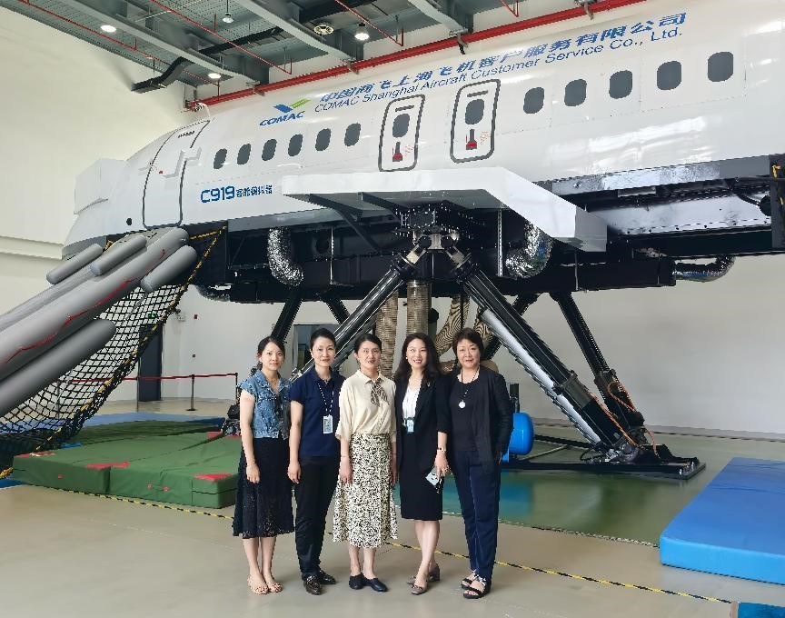 期间,民航乘务学院院长杨晓青也应邀来到上海飞机客户服务有限公司,与客户培训事业部部长陆晓华和客户培训事业部乘务训练室主管李青进行了友好且深入的交流,双方就如何进一步加强校企合作、促进学院教师和商飞教员之间的互相交流和学习、提升学院专任教师的双师能力、素质以及推动国产大飞机模拟客舱进校园的构想等交换了意见,并达成了初步的合作共识。随后,李青主管带领其他几位商飞的骨干教员陪同学院老师参观了C919和ARJ21的相关实训场地并合影留念。