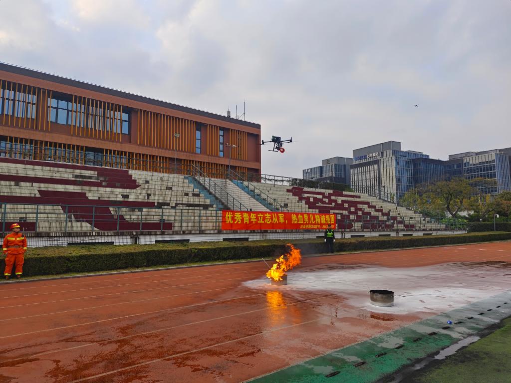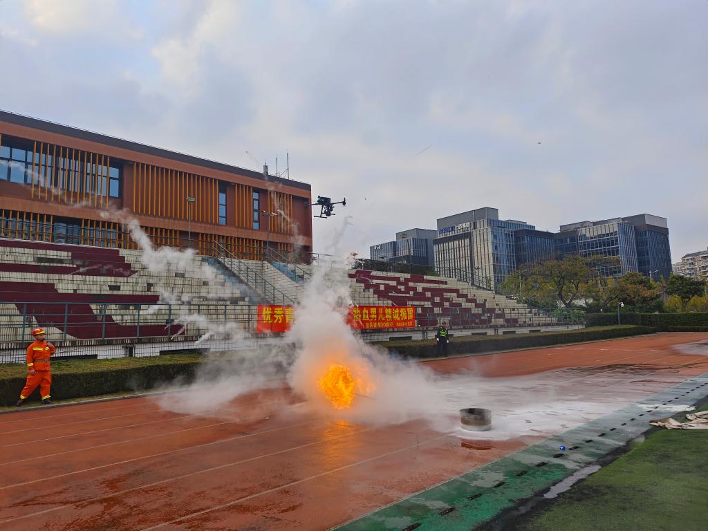一是逃生疏散:模拟火灾情境,在无人机利用高分贝喇叭对着火宿舍楼喊话引导宿舍楼宇的学生及时疏散下,所有学生能够做到迅速用湿毛巾捂住口鼻,低头弯腰,按照指定的疏散路线快速、有序撤离至操场安全区域。整个过程在无人机、辅导员、教导员、学导员、物业、保安等人员的指挥指导下紧张有序,迅速撤离到安全区,总用时4分58秒。检验了紧急疏散预案的有效性和师生的自救互救能力。
