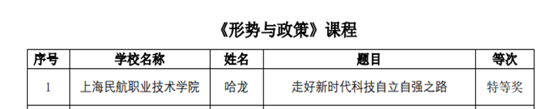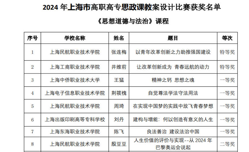 为深入学习贯彻习近平总书记对学校思政课建设作出重要指示,不断开创新时代思政教育新局面,推动建设思政课教师队伍,守正创新推动思政课建设内涵式发展,不断提高思政课的针对性和吸引力。上海高校思政课教指委高职高专分委及上海高职高专思政课建设联盟联合举办了“2024年上海市高职高专院校思想政治理论课教案设计比赛”。经过前期校内选拔、学校推荐及专家组的严格评审,我院教师张连梅、哈龙荣获特等奖,周琦、周文静两位教师斩获一等奖,殷豆豆老师获得二等奖。