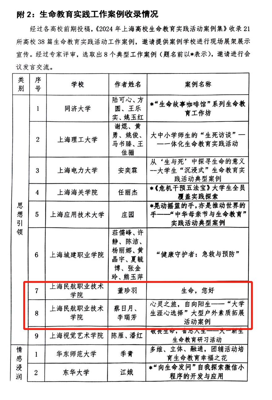 为落实教育部等十七部门《全面加强和改进新时代学生心理健康工作专项行动计划(2023—2025年)》、《上海市教育委员会关于进一步加强高校心理健康教育工作的通知》等文件精神,由上海市教委德育处立项支持、上海学生心理健康教育发展中心指导、东华大学举办了2024年上海高校生命教育实践典型工作案例征集及展示活动,《2024年上海高校生命教育实践活动案例集》收录21所高校38篇生命教育实践活动工作案例。我院有4篇案例成功入选。