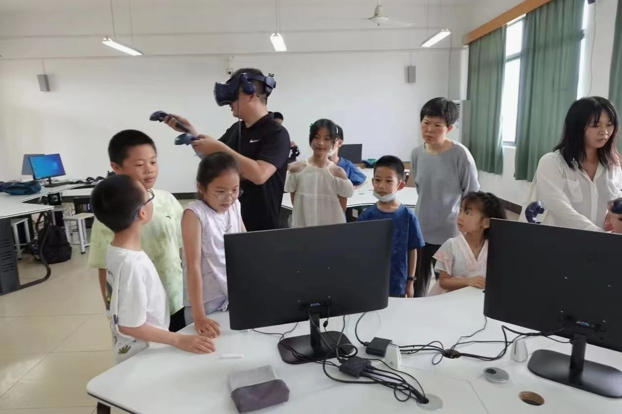 校校联动开展职业体验日活动,图为中小学生正在进行波音737飞机VR体验