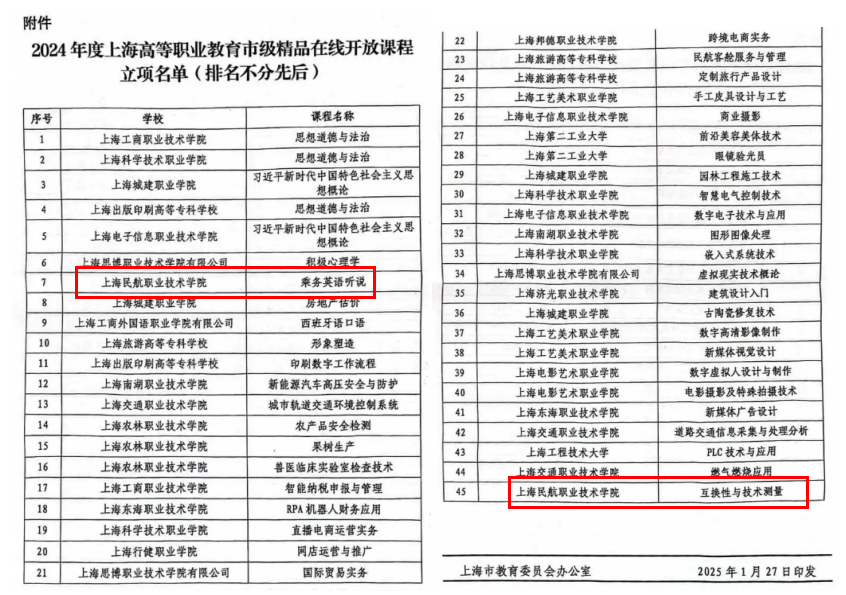 近期,上海市教育委员会发布《关于公布2024年度上海高等职业教育市级精品在线开放课程立项名单的通知》(沪教委职〔2025〕3号)。上海高职院校共有45门课程,其中我院《乘务英语听说》和《互换性与技术测量》2门课程上榜。