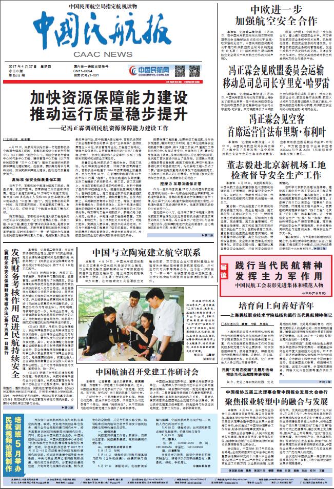 2017年4月27日《中国民航报》第1版刊登我校“弘扬和践行当代民航精神”文章