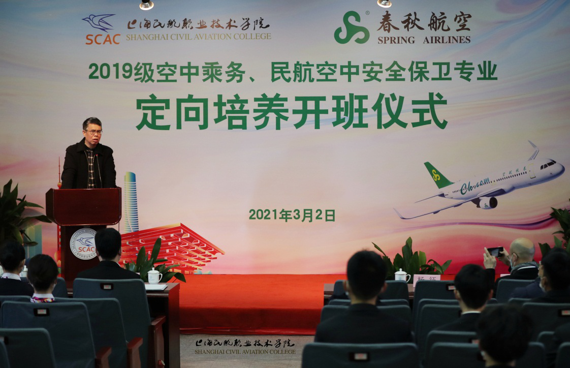 3月2日,学院2019级春秋航空空乘、空保专业定向培养班开班仪式在徐汇校区第二教学楼报告厅举行。春秋航空人力资源部总经理王天和,上海春秋教育培训中心校长林莉,人力资源部总经理助理肖飞,学院副院长杨征,航空乘务系主任、党支部副书记孙军,航空乘务系党支部书记、副主任吴欣,学工处副处长杨必忠,航空乘务系全体干部出席开班仪式,定向培养班辅导员和学生参加仪式。仪式开始后,杨征副院长作开班致辞。他回顾了学院与春....