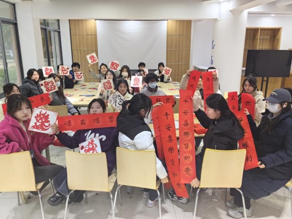 四气新元旦,从今诸事愿。2023年12月29、30日,学生工作处在浦东校区尚能学堂举办了“庆元旦 迎新年”系列活动,60余位留校同学参加了写春联、剪窗花、乐桌游等活动。活动邀请了学院学生书法社社员2312102班姜泽鹏指导同学们写春联,他详细地为同学们讲解了书写春联的注意事项,同学们挥毫泼墨,饱含热情,用工整对仗、精巧简洁的文字创作出了一幅幅年味浓、寓意好,喜庆满满的春联,将真诚的祝福赋诸笔端。 另一组同学们体....