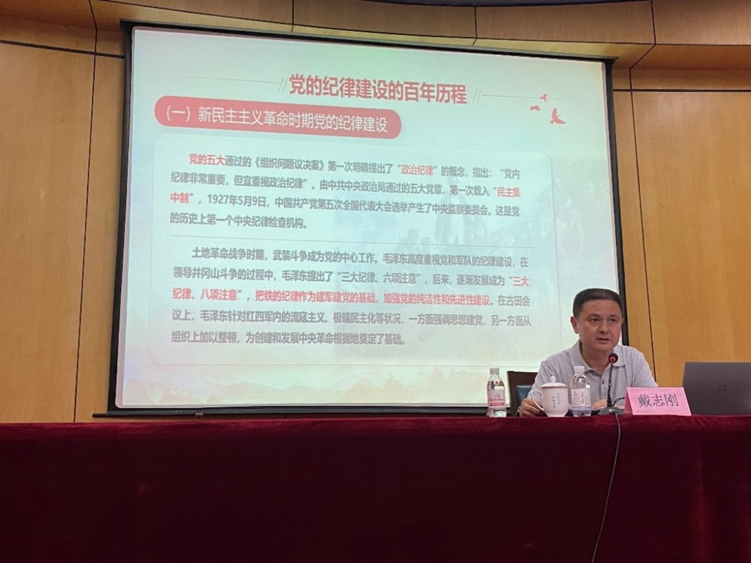 为深入贯彻落实习近平总书记关于党纪学习教育的重要讲话精神和重要指示精神,进一步深化对《中国共产党纪律处分条例》的理解和贯彻落实,推动党纪学习教育深入人心,教育引导党员干部守纪律、讲规矩,做到学纪、知纪、明纪、守纪,6月27日,学院党委书记戴志刚为民航乘务学院党总支全体党员干部讲授题为“纪律建设的百年历程与经验启示”的专题党课。民航乘务学院院长、党总支副书记孙军主持。戴志刚书记的讲座分为两个部分。第...